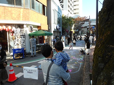 社会実験では、マルシェの出店やストリートミュージック、子供達によるチョークアートなどが行われていました。
